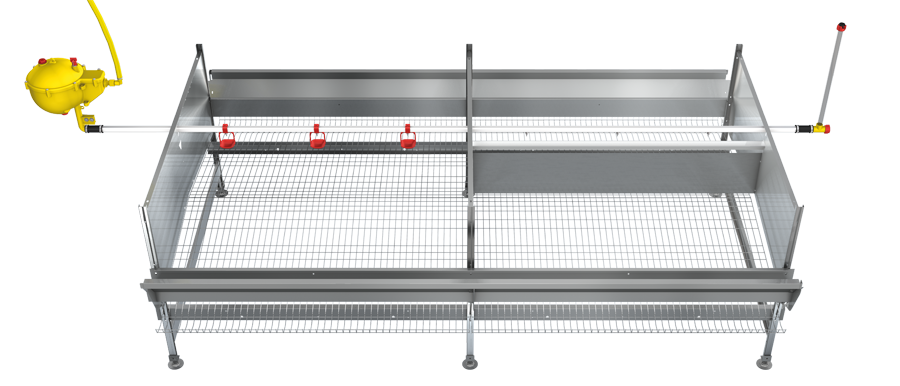 Para garantizar el suministro óptimo de agua para todas las aves en el sistema, la línea de bebedero es instalada a una altura de 38-41 cm de distancia de la línea de alimentación. A través del ciclo de las aves entre la línea de bebedero y la línea de alimentación, el agua no alcanza el canal de alimento.